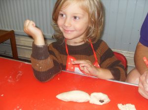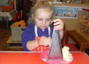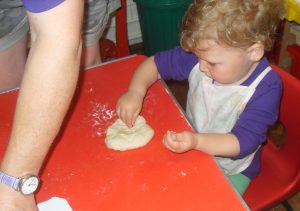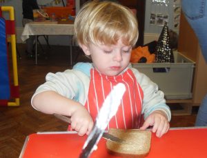 Tuesday is baking/food prep day. The children practise physical skills, learn new manipulative skills, taste different foods, count, measure, mix, shape and create. This term they have helped to make bread shapes, banana muffins, vegetable soup, Halloween ginger biscuits, filled sandwiches, cheese and apple scones and flavoured bread. Tomorrow they will build fruit skewers!